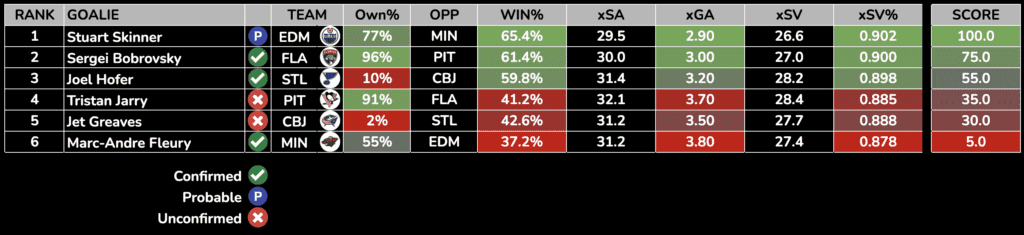 Each day, we will rank the day’s starting goalies based on their Projected Win%, Goals Against Average, and SV%. Win percentage and expected goals against is generated from Sportsbooks Odds and Implied Totals.