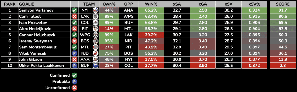 Each day, we will rank the day’s starting goalies based on their Projected Win%, Goals Against Average, and SV%. Win percentage and expected goals against is generated from Sportsbooks Odds and Implied Totals.