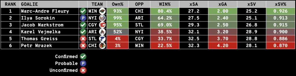 Keep an eye on our Starting Goalies page to ensure the goals listed below are CONFIRMED to start.