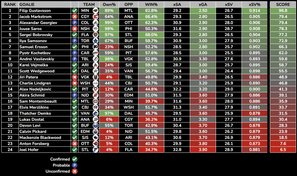 Each day, we will rank the day’s starting goalies based on their Projected Win%, Goals Against Average, and SV%. Win percentage and expected goals against is generated from Sportsbooks Odds and Implied Totals.