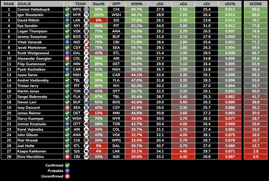 Each day, we will rank the day’s starting goalies based on their Projected Win%, Goals Against Average, and SV%. Win percentage and expected goals against is generated from Sportsbooks Odds and Implied Totals.