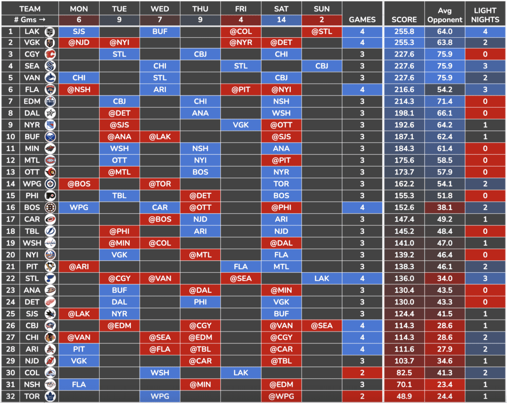 I took that weekly schedule and combined it with a Team Defense Score I created using key defensive metrics to find which teams/skaters have the best schedule this week.