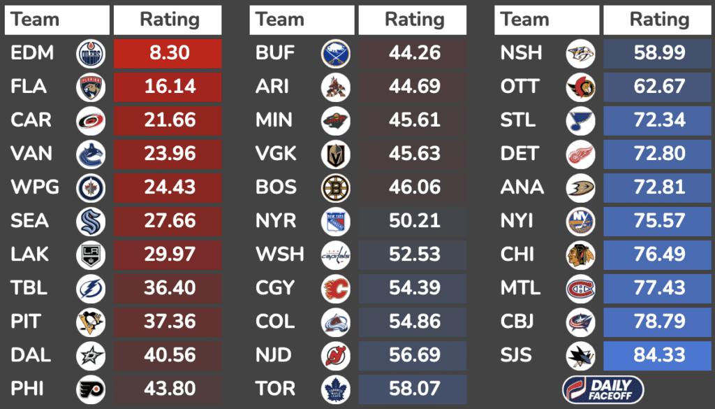 Team Ratings are based solely on defensive metrics and goaltending quality in order to identify the best matchups for skaters. They are in no way a reflection of overall team quality. The lower the rating, the better the team is defensively = worse skater matchup.