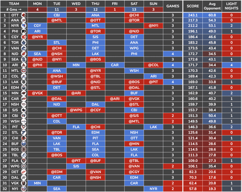 The Coyotes’ opponents aren’t super favourable (@PHI, MIN, CAR, @COL) but all four of their games are on ‘Light Nights’ so you’ll have no issues getting them into your lineup.
