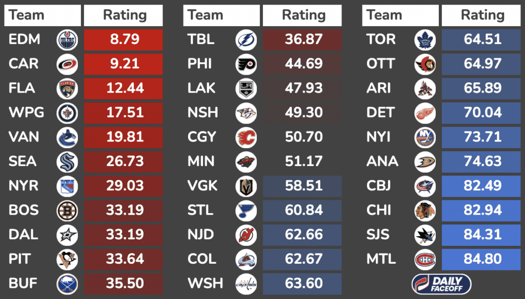 Team Ratings are based solely on defensive metrics and goaltending quality in order to identify the best matchups for skaters. They are in no way a reflection of overall team quality. The lower the rating, the better the team is defensively = worse skater matchup.