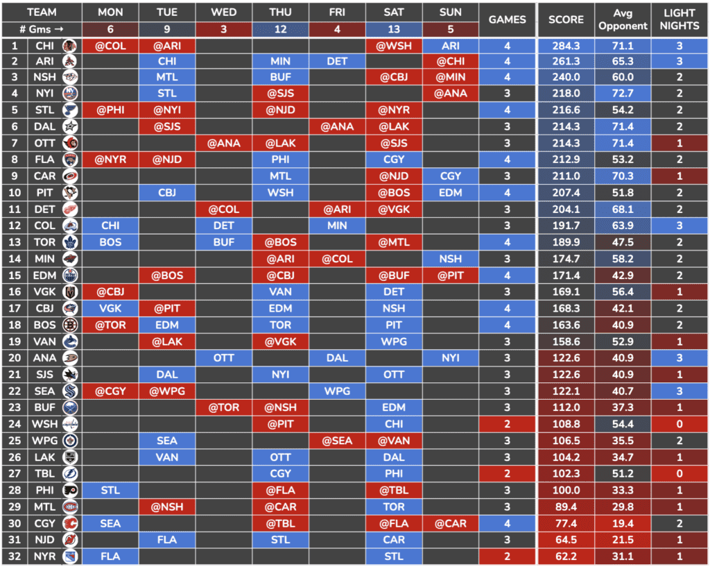 I took that weekly schedule and combined it with a Team Defense Score I created using key defensive metrics to find which teams/skaters have the best schedule this week.