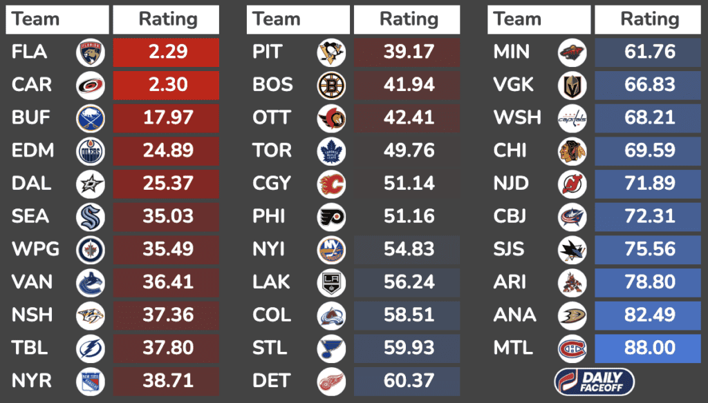 Team Ratings are based solely on defensive metrics and goaltending quality in order to identify the best matchups for skaters. They are in no way a reflection of overall team quality. The lower the rating, the better the team is defensively = worse skater matchup.