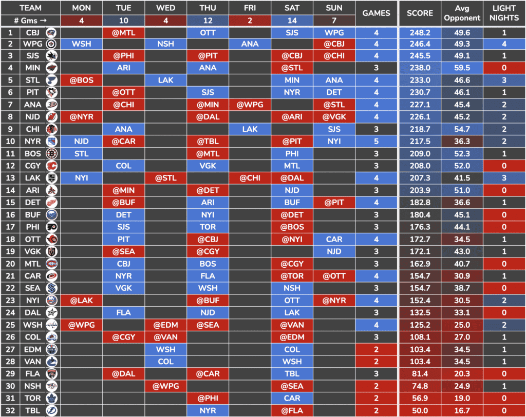 The Jets have the second-easiest schedule this week, and all four games are on light nights, making them a streamer’s dream. However, they don’t have a ton of streaming options, but Sean Monahan looks like the best target of Week 22 if he’s available in your league.