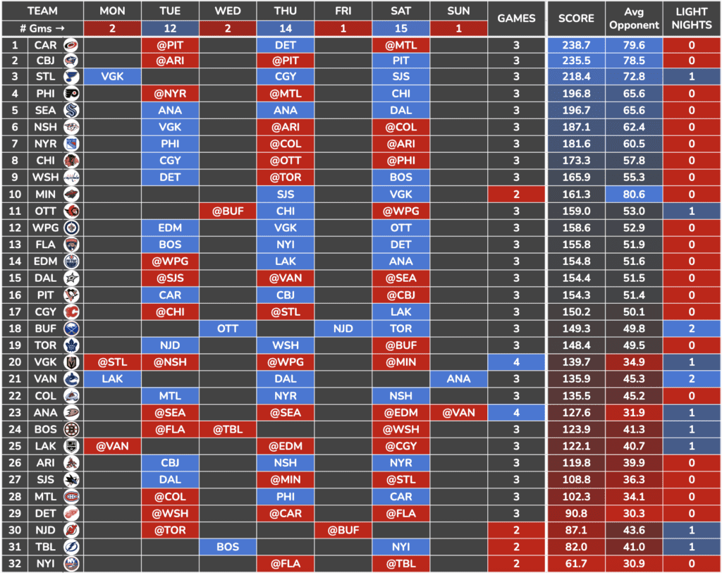 I took that weekly schedule and combined it with a Team Defense Score I created using key defensive metrics to find which teams/skaters have the best schedule this week.