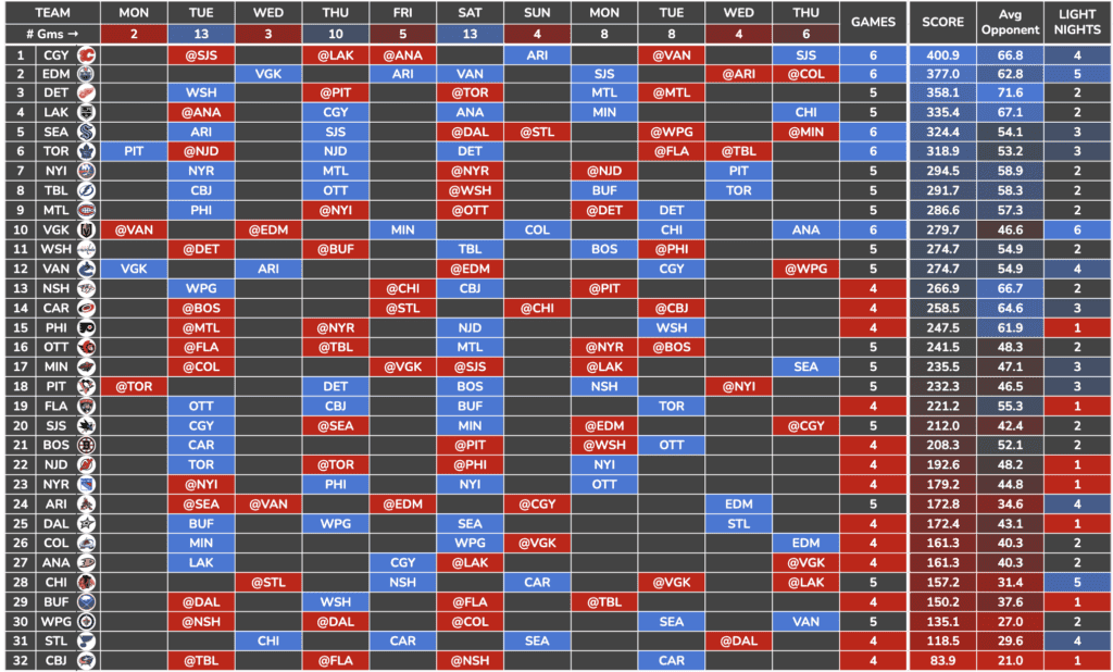 I took that weekly schedule and combined it with a Team Defense Score I created using key defensive metrics to find which teams/skaters have the best schedule this week.