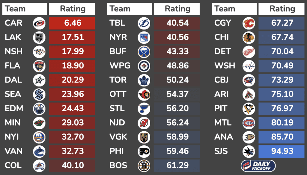 Team Ratings are based solely on defensive metrics and goaltending quality in order to identify the best matchups for skaters. They are in no way a reflection of overall team quality. The lower the rating, the better the team is defensively = worse skater matchup.