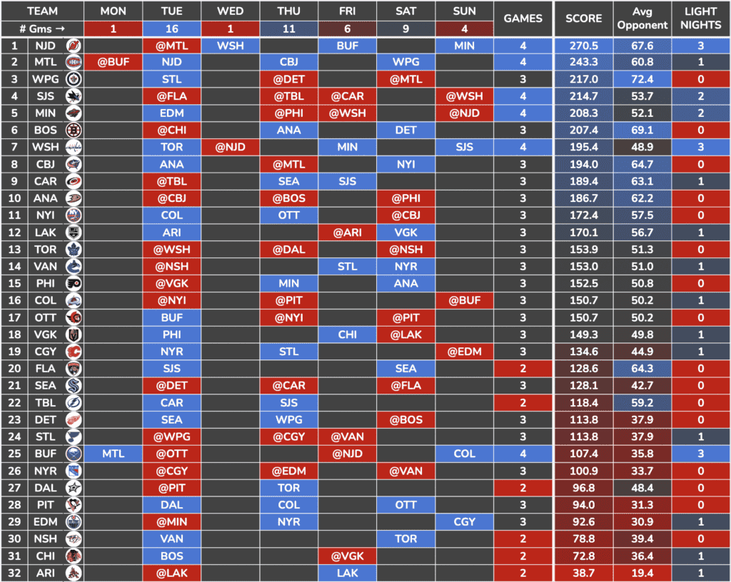 I took that weekly schedule and combined it with a Team Defense Score I created using key defensive metrics to find which teams/skaters have the best schedule this week.