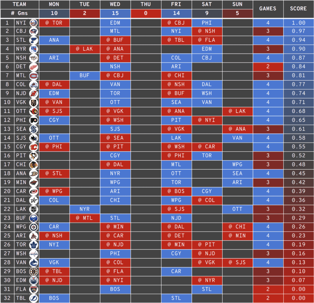 I took that weekly schedule and combined it with a Team Defense Score I created using key defensive metrics to find which teams/skaters have the easiest schedule this week.