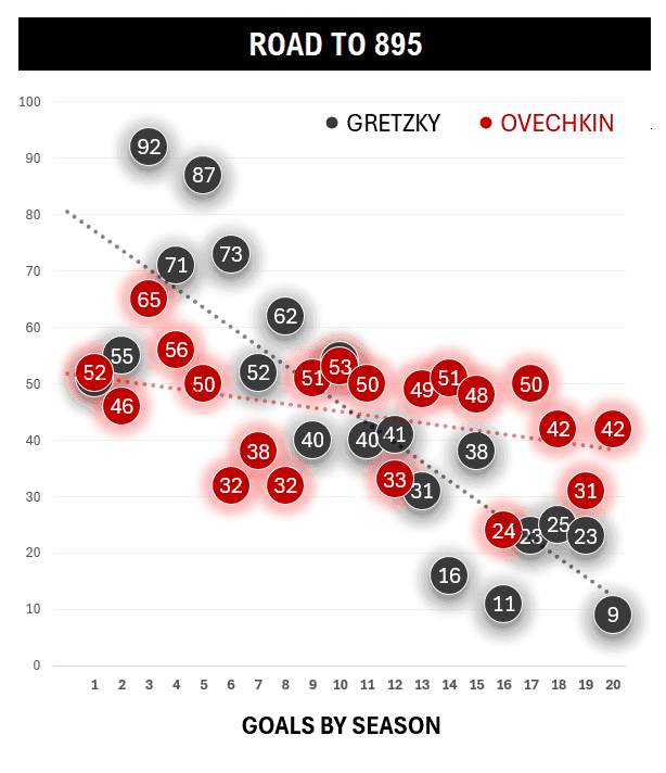 Yet, when when we contrast Ovechkin and Gretzky’s age curves, it’s a stunning visual.