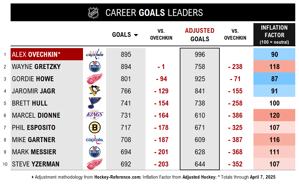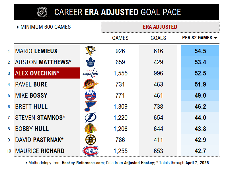 Marcel Dionne has the sixth most goals ever. In a neutral scoring environment, Ovechkin is nearly 400 goals better. For context, Leon Draisaitl has 399 goals in 11 seasons. Ovechkin is Leon Draisaitl’s career better at scoring goals than a guy with 731 of them. Era adjusted, the only player even close is Gordie Howe (71 goals back), who famously played 26 seasons.