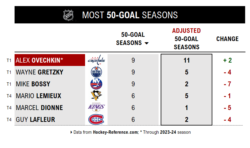 The graphic shows a stunning shift. Instead of a three-way tie, Ovechkin hits the 50-goal mark 11 times. Gretzky drops from nine 50-goal seasons to five, while Bossy remarkably loses seven 50-goal seasons.