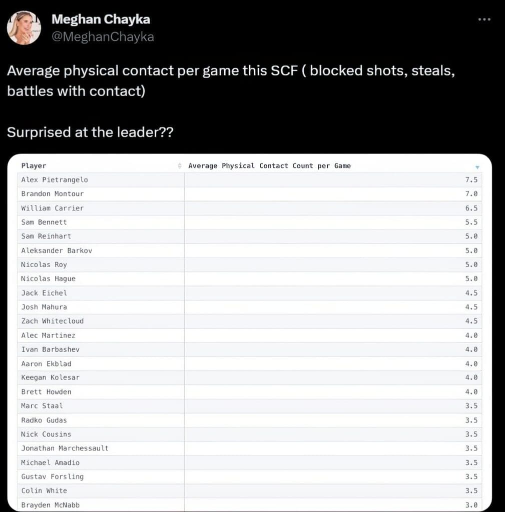 In a tweet posted by Stathletes’ Meghan Chayka, it’s actually Vegas defenseman Alex Pietrangelo leading the way with an average physical contact number of 7.5 per game, taking into account blocked shots, steals and battles involving contact. Brandon Montour, Sam Bennett, Sam Reinhart and Aleksander Barkov are the Panthers with 5.0 or over, while William Carrier has 6.5 for the Golden Knights.