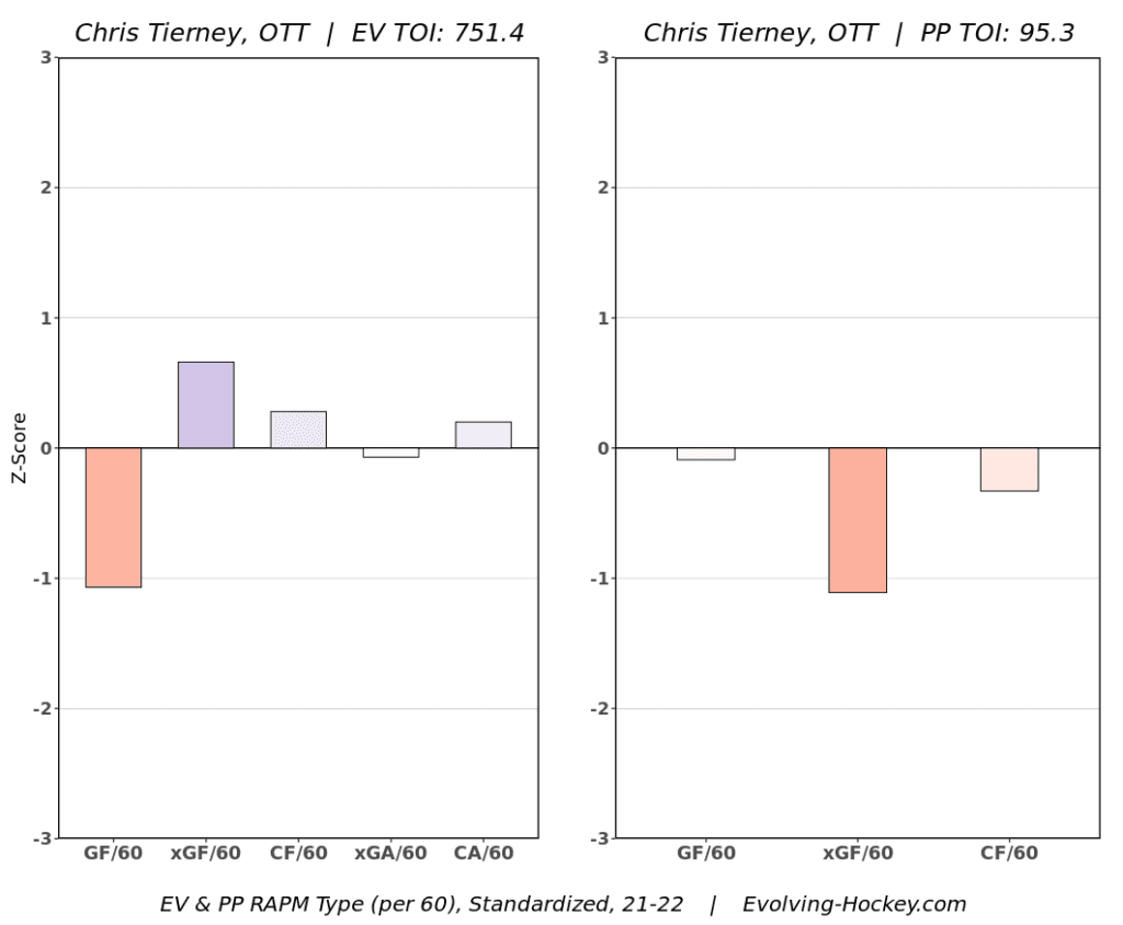 However, a lot of that was due to some poor luck on Tierney’s end. The Senators shot just 6.19% at even strength when Tierney was on the ice, fourth worst among Sens players with at least 500 5v5 minutes, and second worst total of his career, so he should see a bit of a bounce back in that regard. He backs that up with decent play-driving skills, with a 47.3% shot attempt share and 47.9% expected goals share. Not amazing numbers, but his regularized-adjusted plus/minus indicates that that’s more on the team than him, so he should be a solid fit on a much better Panthers team.