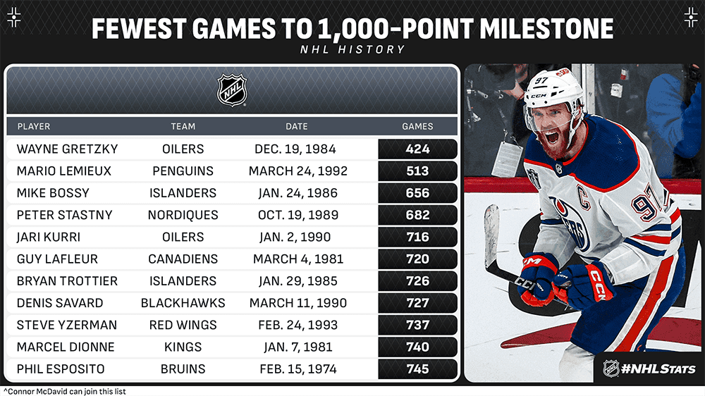 Courtesy of the NHL, here are the 11 players to reach 1,000 points in the fewest number of games. McDavid is eight points short of membership to the club — 992 points in 655 games.