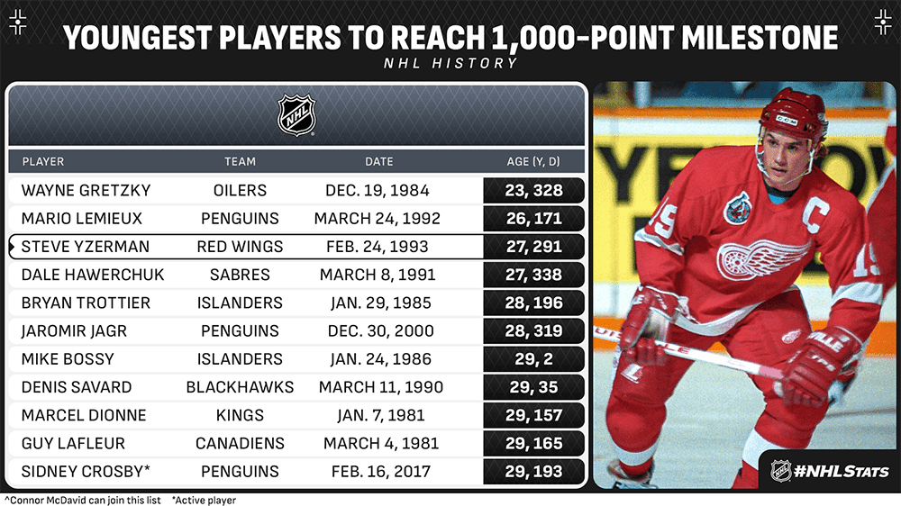 In a league that already had its centennial, the 10 fastest players to 1,000 points did so in a 12-year span. Yes, really. No one has slipped onto the list since Steve Yzerman in 1993 — four years before McDavid was born. Yzerman, now the Red Wings‘ GM, is approaching his 60th birthday.