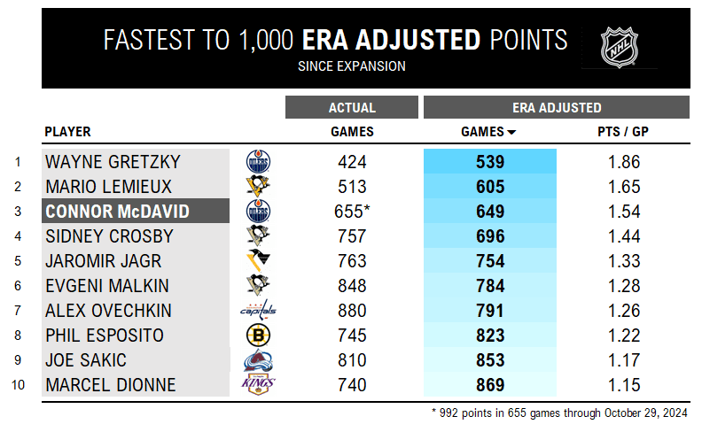Adjusted to era, McDavid is comfortably the third-fastest to 1,000 points, which we’ll get to shortly. In fact, he was already at 1,055 points when he hobbled off the ice in Columbus on Monday.