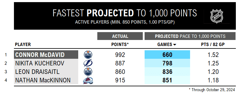 • McDavid stands alone. He’s projected to get to 1,000 points 138 games faster than Kucherov, 176 ahead of frequent linemate Drasaitl, and 191 games before MacKinnon. A staggering gap.