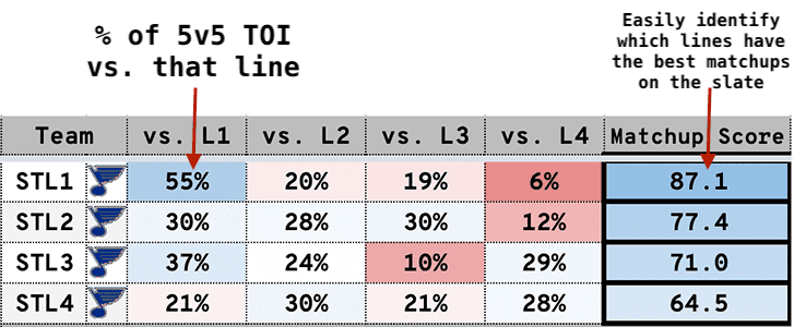 I break down each game, which lines will face each other the most and which lines have the most advantageous matchups on the slate. Their matchup score is based on the percentage of time they will face each line x their opponent’s Defensive Score and then Ranked from 0 to 100 for that specific slate.