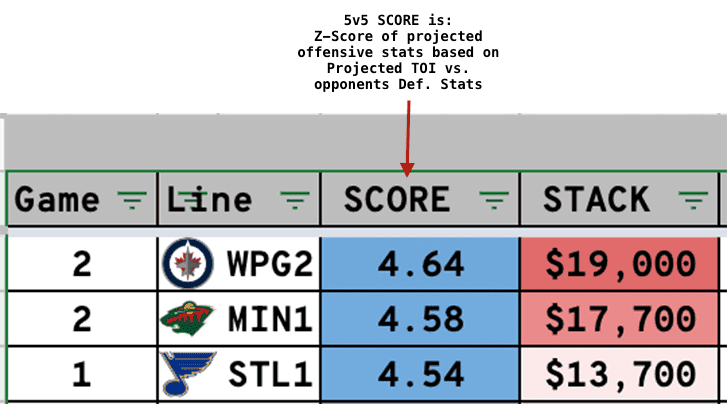 Every single number in the charts is condensed into the 5v5 SCORE. It basically simulates each game with the TOI I have projected vs. each line and determines which lines are most likely to generate scoring chances and expected goals. Those projections are compared to every other line on the slate to give you a 5v5 SCORE. The higher the score, the better they are are for that slate.