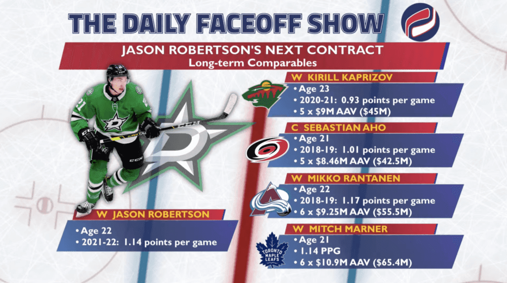 If the Stars are prepared to go with a longer term, as they probably should given the leadership role Robertson will play on their team going forward, the comparables have even bigger tickets. One is Kirill Kaprizov, who in September 2021 signed a five-year, $45-million (AAV of $9 million) contract after a 2020-21 season where he produced at a rate of 0.93 points per game. Dallas will argue that the Kaprizov contract was inflated due to Minnesota’s need to guard against the player’s potential retreat to the KHL, but it is still a number the Stars will need to contend with.