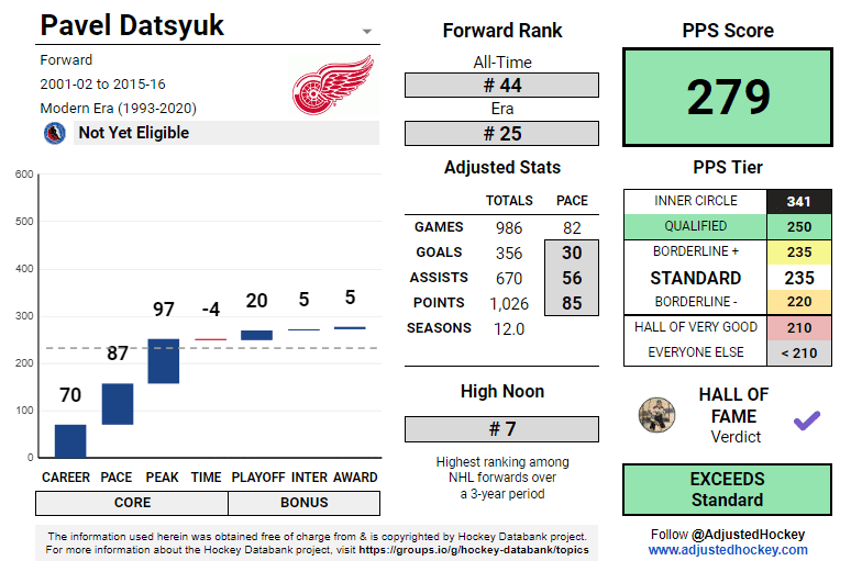Grade: A. Datsyuk was the #1 choice in public polling, #2 to John LeClair statistically in PPS, and only long-time oversight Alexander Mogilny got more HHOF attention on social media over the last year.