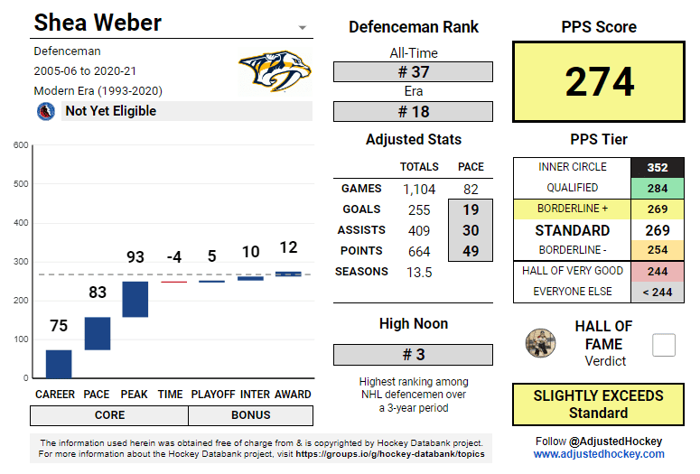 The Credentials: Weber scored more goals (224) than all other defenders throughout his career. He finished top 10 in Norris voting nine times straight, a remarkable achievement in sustained elite play. Weber was a key figure in each of his three best-on-best international events – all wins.
