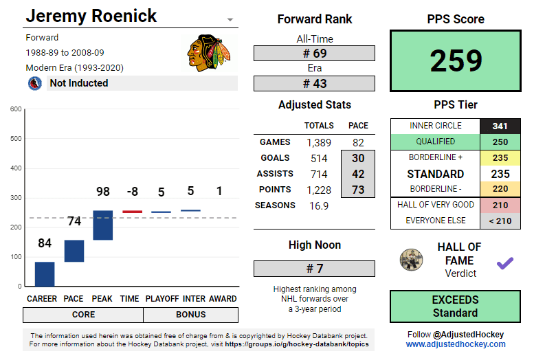 Grade: B-minus. While Roenick’s media dismissal gives pause, it seems more the immature rantings of a famously ignorant man than a move that ends a hockey life. On the ice, you can argue that the HHOF should induct fewer players. But the Hall is built big. 8% of players before expansion were inducted, and the Committee regularly uses its maximum male player slots. Roenick’s play exceeds the standard.