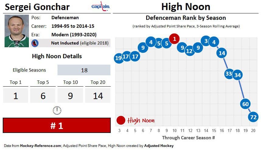 • Want all-world status? Gonchar had a cameo as the #1 defenseman in the NHL. Since 1950, only Mike Green hit #1 in High Noon yet remains outside the Hall among eligible D-men.