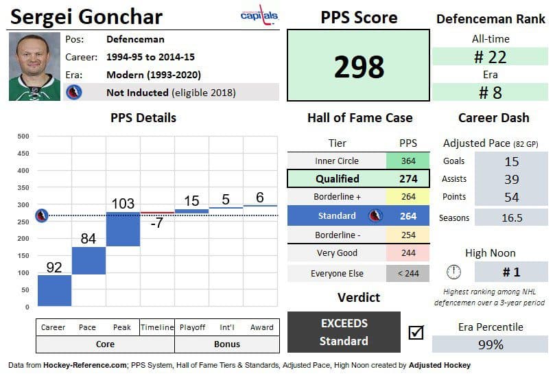 Of the 25 post-expansion HHOF defensemen, his Career score of 92 is middle-of-the-pack — tied with legend Scott Niedermayer. By Pace score (84), Gonchar is 18th, i.e., Scott Stevens territory. Keep your head up, Sergei! His Peak score (103) is solidly in 16th place, edging Borje Salming and Larry Murphy at 101.