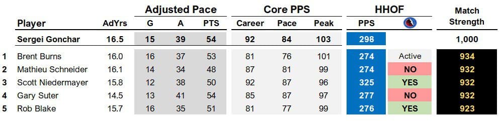 Playing matchmaker with Gonchar shows him to be a unicorn. He profiles statistically similar to four players far back of him in PPS, and one player (Niedermayer) out of his league.