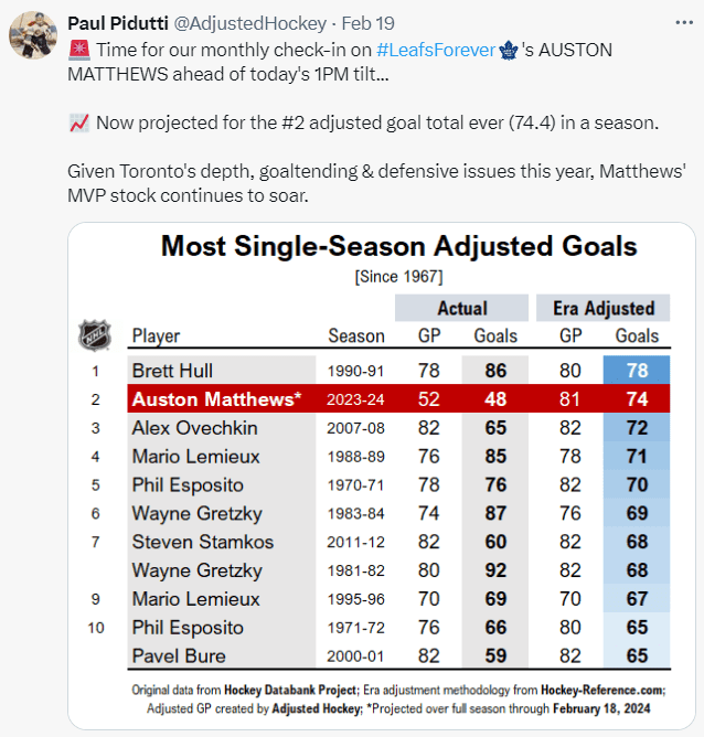 Matthews’ season is as jaw-dropping as it seems — it’s trending toward the second greatest goal-scoring year of all-time. Yes, better than the best of Mario Lemieux and Wayne Gretzky. So far, anyway. Even with a slight cooldown, Matthews should join Alex Ovechkin as the only era adjusted 70-goal scorer in 30+ years.