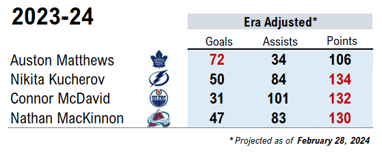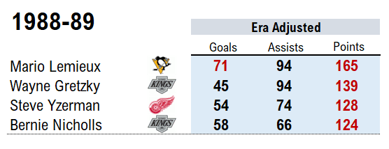 Let’s define dominant as a forward reaching 60 goals or 120 points, adjusted to era. We’re on the hunt for seasons where four superstars approached these rare scoring levels.