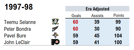 Somehow, four players hit the 50-goal mark, though. Relative to era, Selanne, Bondra, Bure and LeClair were essentially 60-goal scorers — the record books forever understating their brilliance.