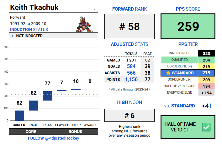 The Case: By PPS, Tkachuk is the second-biggest forward snub behind LeClair. Tkachuk scored 538 goals despite peaking in a low-scoring era. Had the Rocket Richard Trophy been created two years sooner, Big Walt would have one. The induction of American contemporary Jeremy Roenick last year has to elevate Tkachuk’s hopes. The pair profile similarly — Roenick lasted a little longer but Tkachuk was a much more lethal goal scorer. The case against? A dreadful postseason record… 56 points in 89 games, winning only three rounds in an 18-year career.