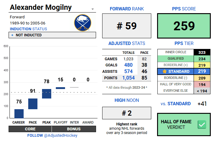 The Case: There’s little left to say about Mogilny’s case. I’ve called him the most glaring Hall of Fame omission. That hasn’t changed. His on-ice case puts him comfortably in the Qualified tier in PPS. The harrowing nature of his defection and the pioneering role he played in Eastern European talent escaping oppression only further seals the deal. The TSN short documentary “Why Isn’t Alex Mogilny in the Hall of Fame?” (for transparency, I was featured in it) is a fantastic sketch of his remarkable hockey life.
