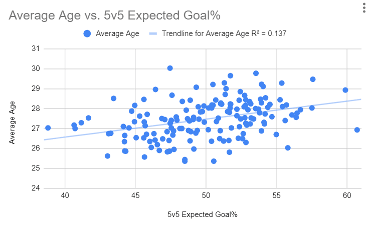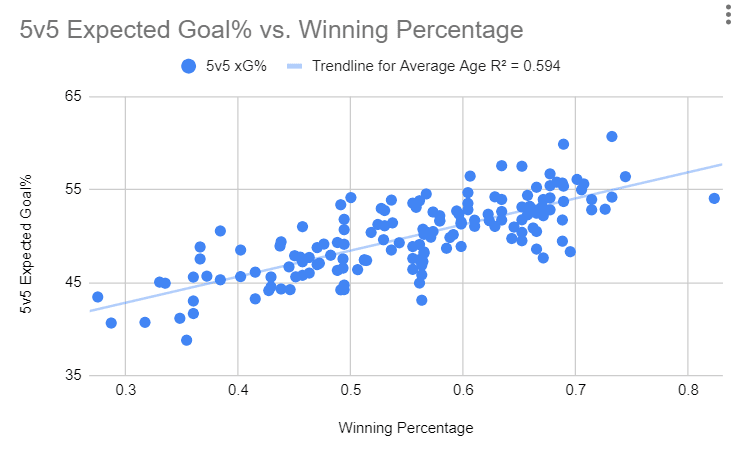 Of course, the thing with looking at just wins is that there is a lot of random variance that goes towards wins. High shooting percentages, goaltenders playing above their heads, and getting the bounces in one-goal games can all contribute to wins that don’t paint the full picture of the team. So, I decided to also look at the average age of these teams in relation to how successful those teams were at driving expected goals at 5v5.