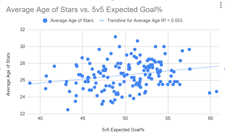 Not only is there no correlation like with the average age of the entire team, it’s actually even worse. The correlation coefficient is just 0.035, implying almost no correlation even with a positive trendline. It doesn’t get much better when you look at its relation to 5v5 expected goal share, which has a correlation coefficient of 0.053.