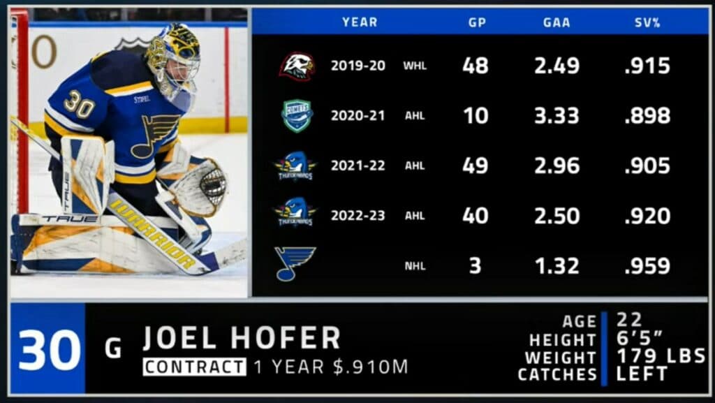 I’m looking forward to seeing how this plays out over the next two seasons because Hofer is on a one-way NHL contract for the next two years. The Blues are locked and set for the next two seasons with Binnington and Hofer; they’ve got less than $7 million tied up in goaltenders that way. You just have to figure out if down the road Binnington cannot quite get back to where his game was previously and now you’ve got Hofer in the mix.