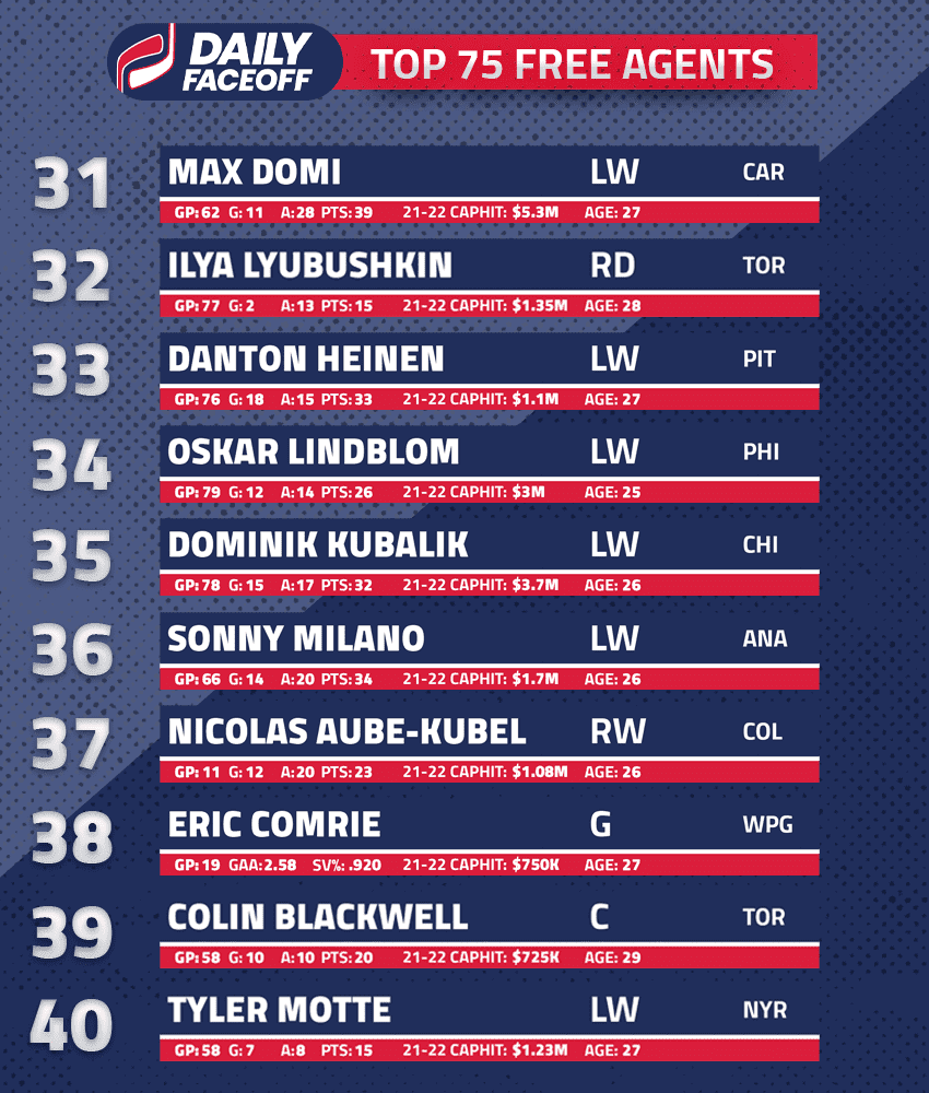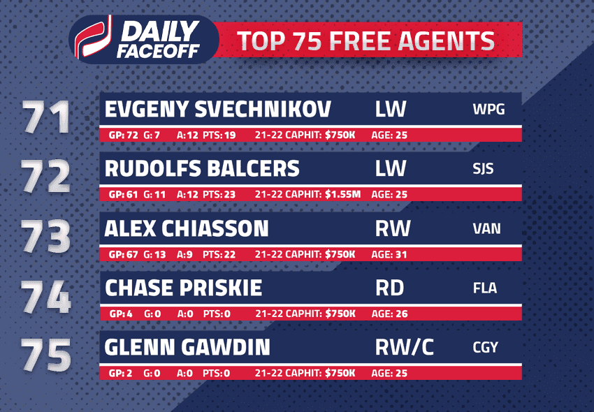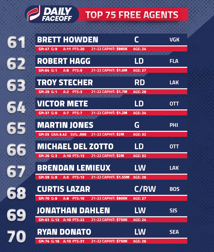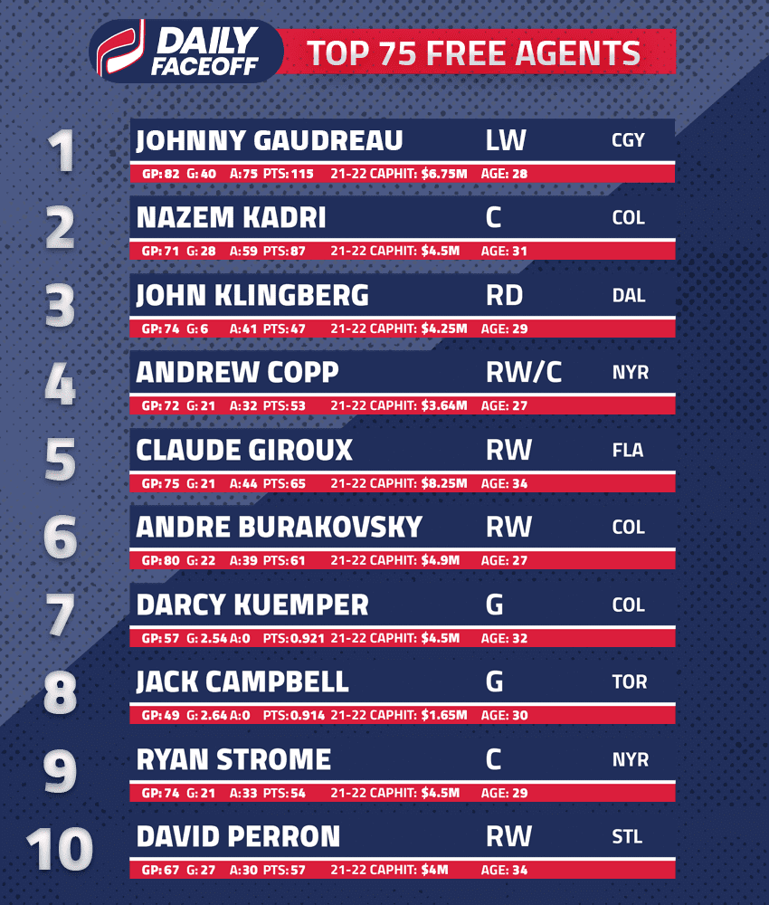 Silly season is here. There will be no shortage of dollars doled out and fortunes changed for franchises. Who’s available? Here is Daily Faceoff‘s final Top 75 Free Agents ranking: