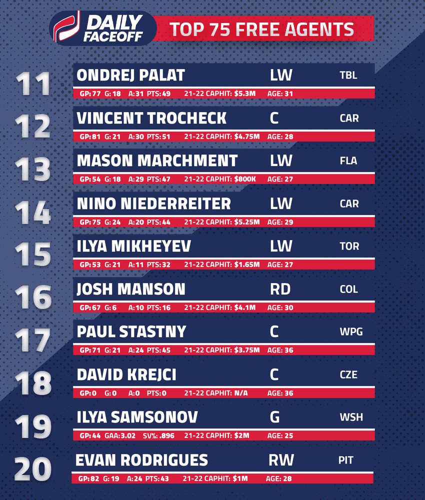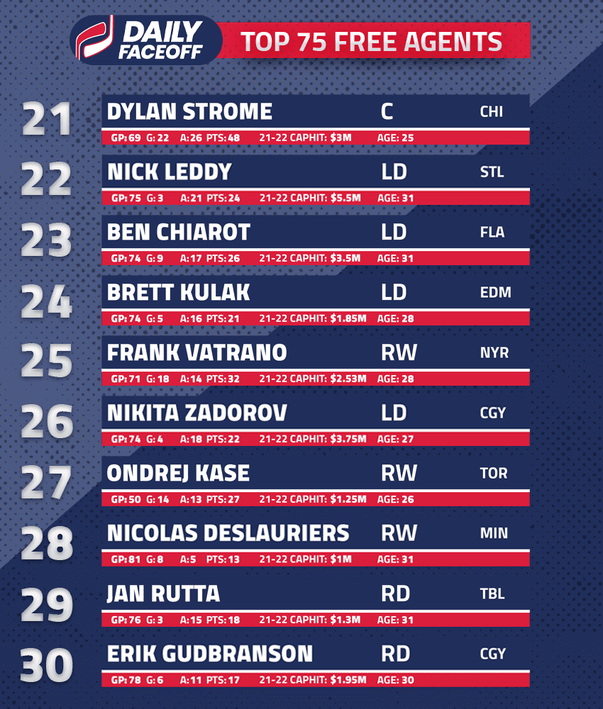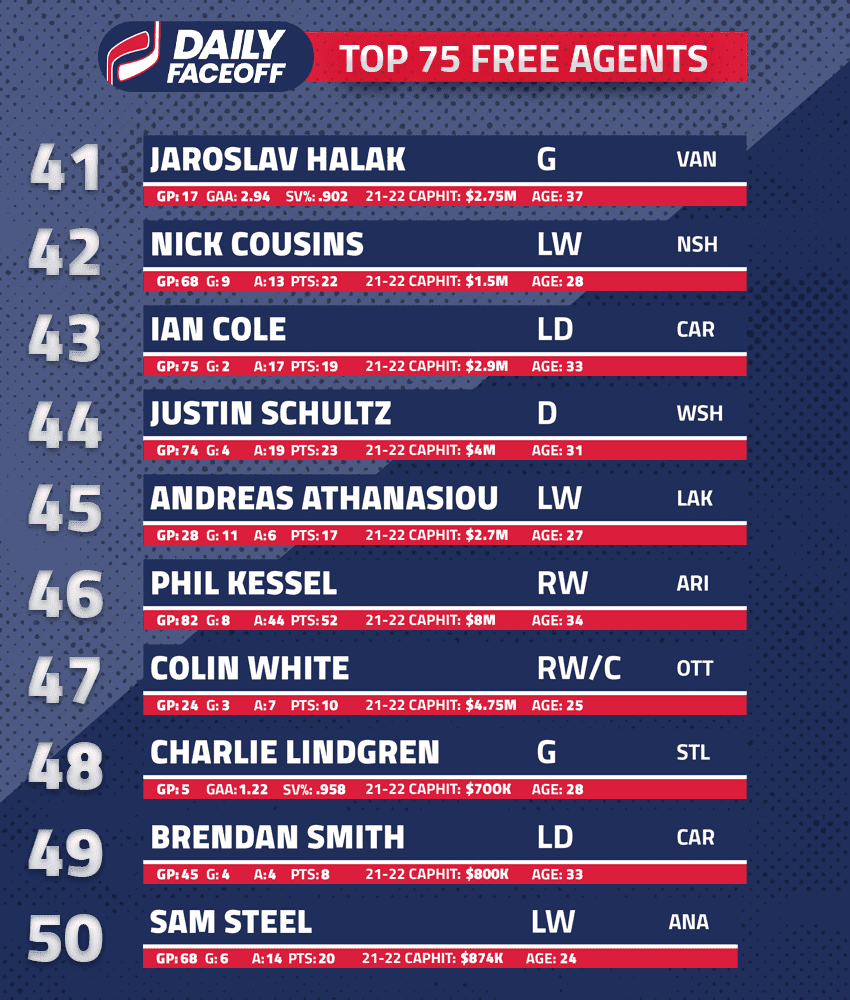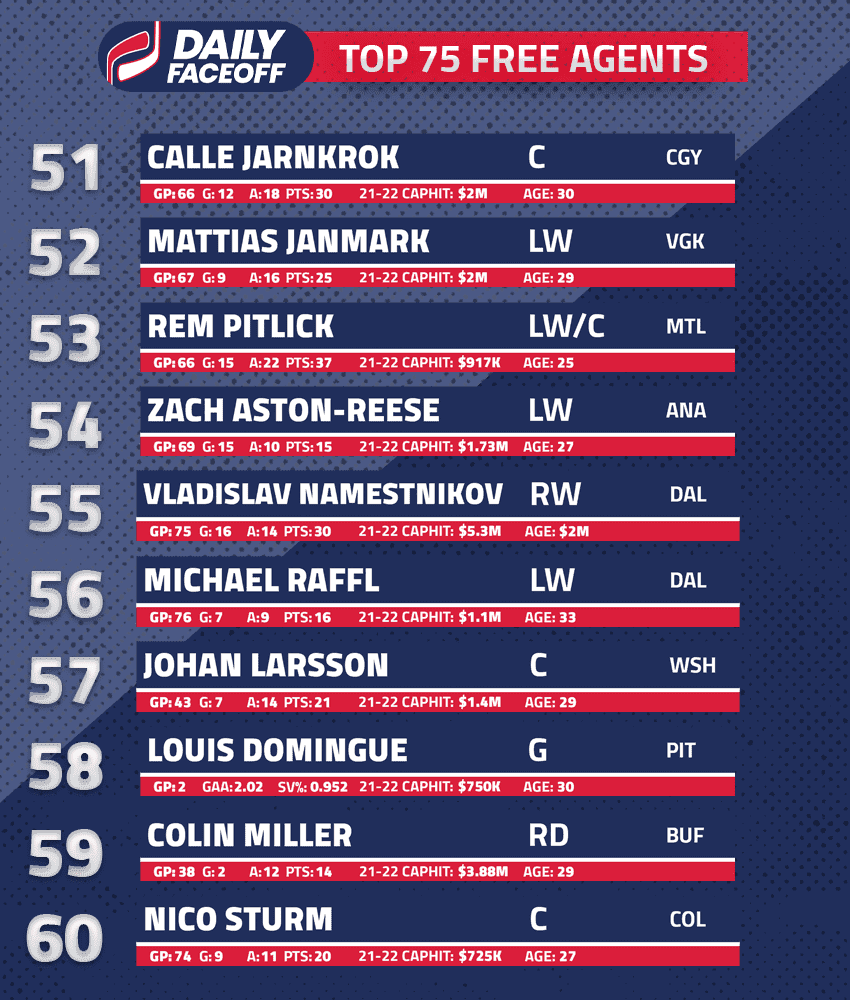 Silly season is here. There will be no shortage of dollars doled out and fortunes changed for franchises. Who’s available? Here is Daily Faceoff‘s final Top 75 Free Agents ranking: