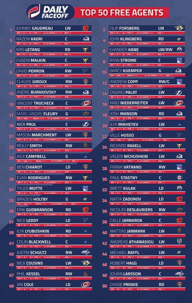 With just over six weeks away, here is Daily Faceoff’s first Top 50 Free Agents ranking of the summer, which uses sourced information and market intelligence to blend a list that factors in both potential impact and total potential dollars earned: