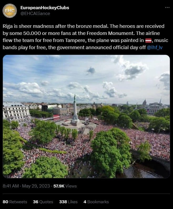 According to Reuters, the last-minute decision to declare a holiday caused some businesses in the area. But that didn’t stop over 50,000 people from attending the Freedom Monument in Riga to celebrate the momentous victory in the nation’s hockey history.