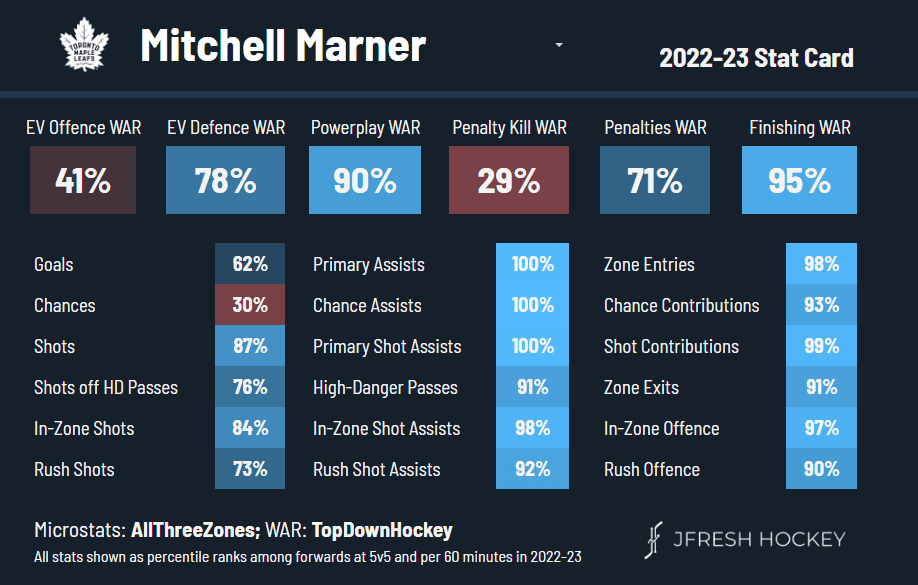We could sit here and talk about his offensive dominance all day long. His decision-making is the thing that stands out the most, especially with how creative he can be to create a play. That’s why he’s on pace for 75 assists this year, something only a handful of forwards – Connor McDavid, Nikita Kucherov and Leon Draisaitl – are going to manage to do this year. But he also leads all Leafs with 2.88 points per game and 2.07 assists per 60 at 5-on-5, with his assist rate being the best of any NHLer with at least 1,000 minutes of even-strength playing time.