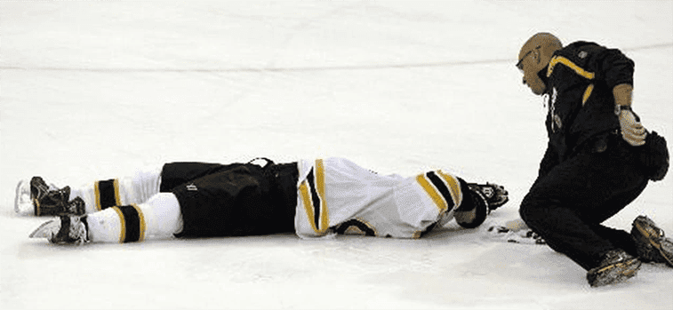 We remember rising up from our seat in the press box, along with other members of the media, after we realized who the Bruins player was slumped on the ice was. Savard reached momentarily for his head as he tried to get up and then slid back to the ice.