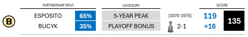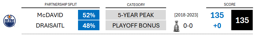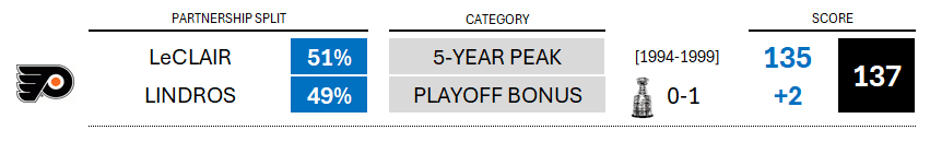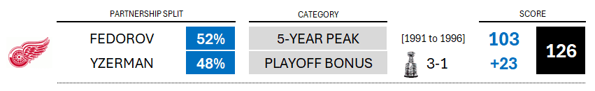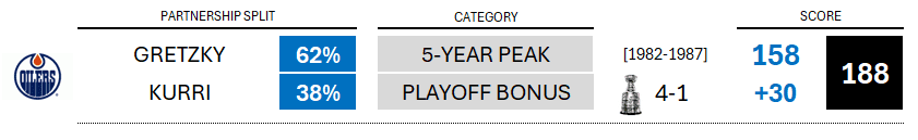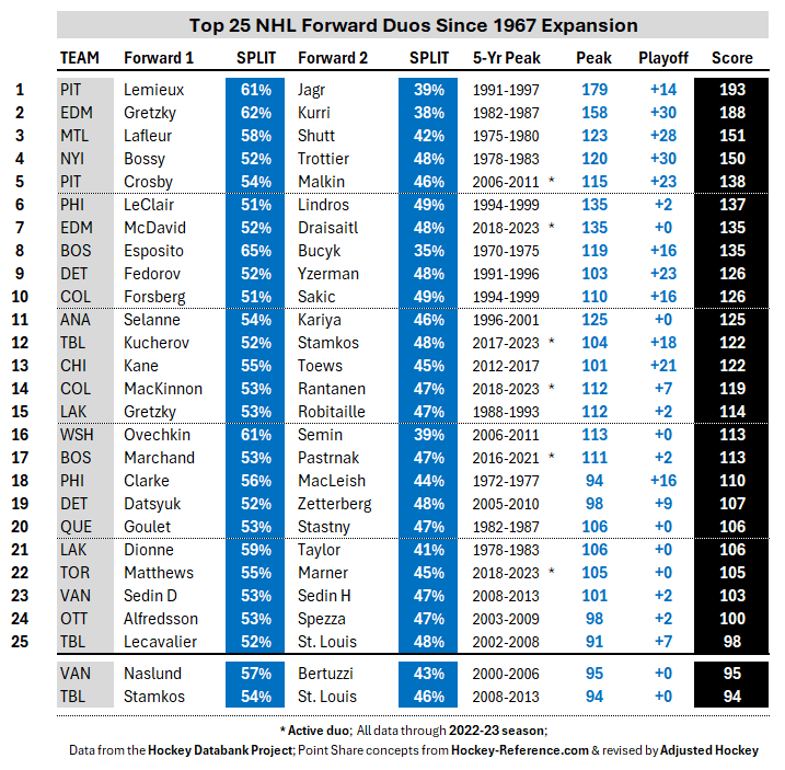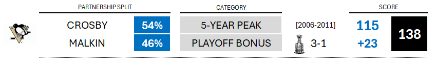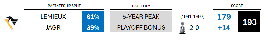 By pure ability, the Penguins original two-headed monster is untouchable. Incredibly, if we covered their five seasons from 1992 to 2001 — a nine-year odyssey where Lemieux beat cancer, retired, returned, sat out another three-plus seasons, and returned again at 35 — their score would be even higher. But that kind of gap would be a stretch to include.
